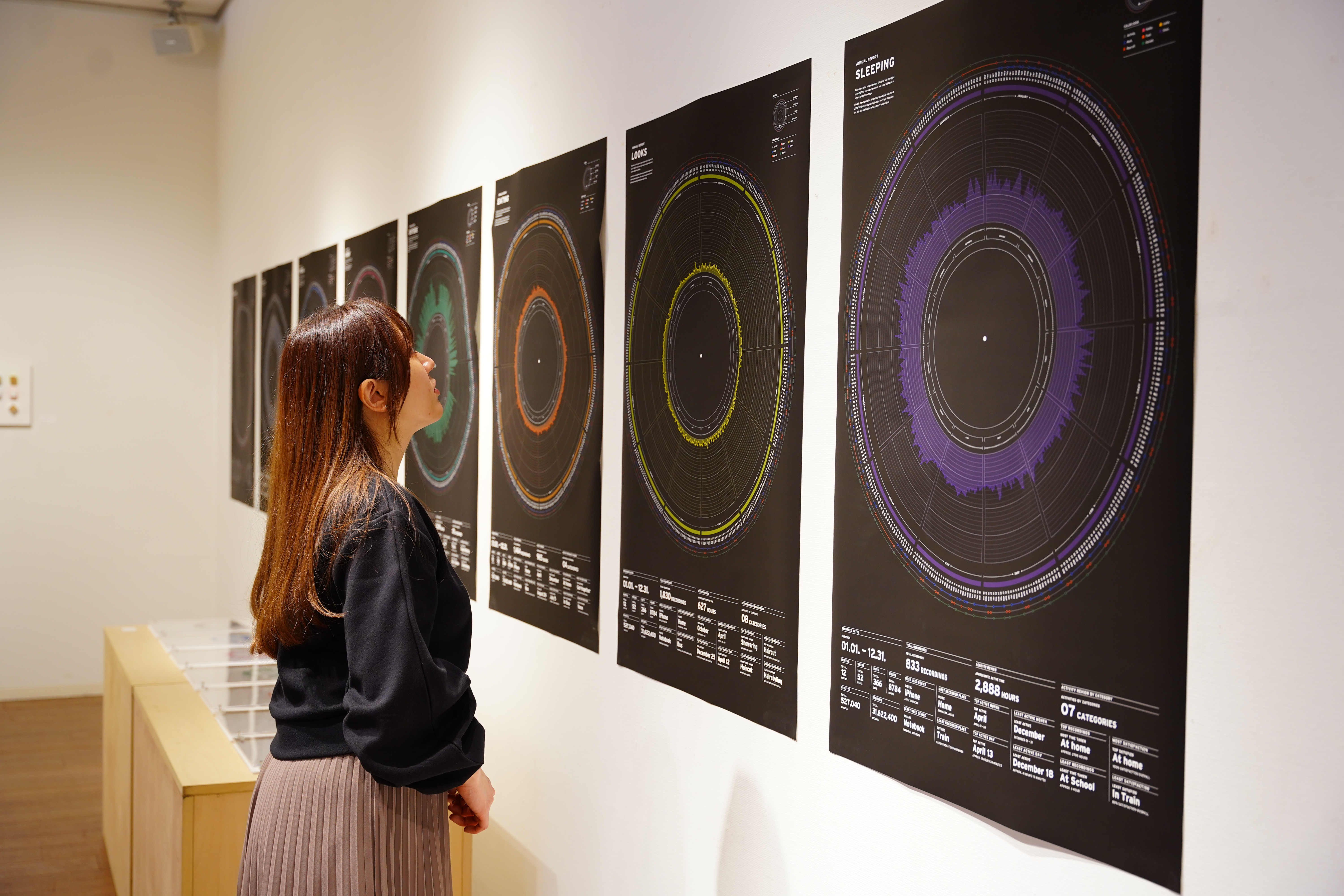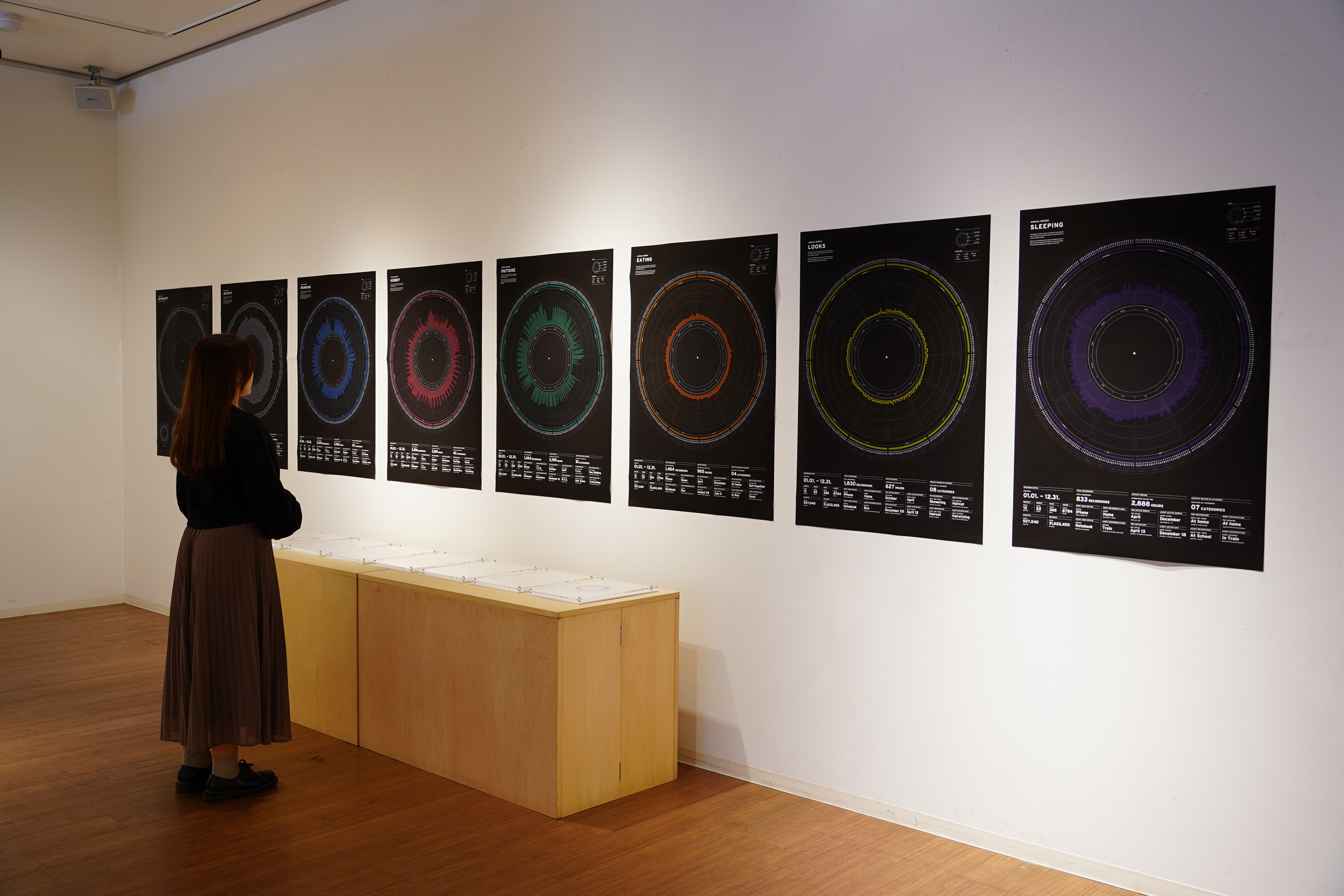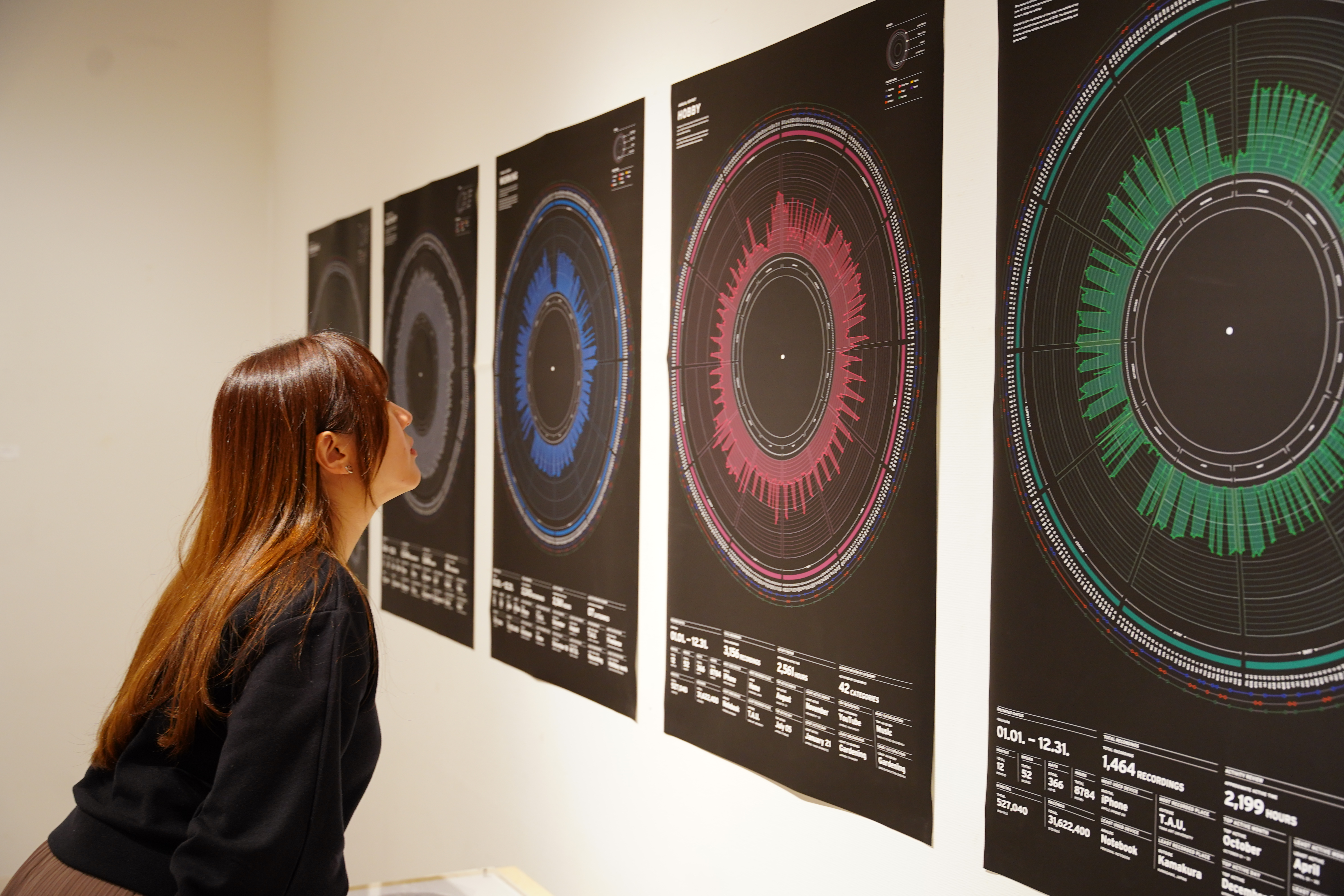 2021With the arrival of the coronavirus in 2020, the world has entered an era of negative news. My own work has moved online and I am spending more time at home, so my days are completely different from before. While I was stuck at home, I had more time to face myself, and a question arose. Amidst the differences between our lives in the past and the present, how do we form our time and follow our lives? In this work, Resonance, I recorded my time in 2020 in multiple categories and created infographics of my time over the year.